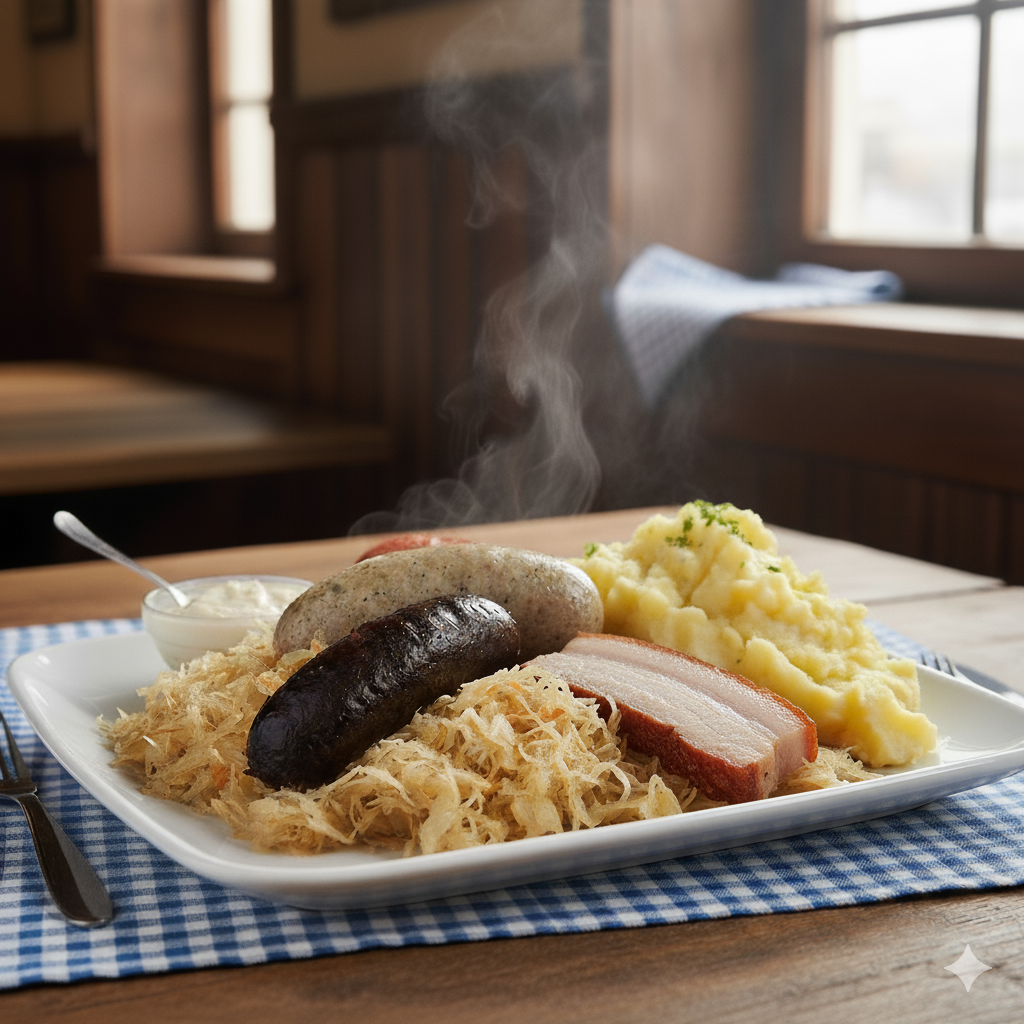 Mit saftigem Schweinebauch, würziger Blut- und zarter Leberwurst sowie perfekt abgestimmtem Sauerkraut und cremigem selbstgemachtem Kartoffelstampf.
